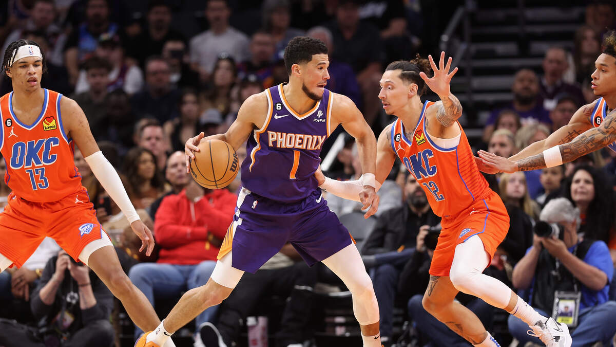 Devin Booker #1 of the Phoenix Suns handles the ball against Lindy Waters III #12 of the Oklahoma City Thunder during the first half of the NBA game at Footprint Center on March 08, 2023 in Phoenix, Arizona. (Photo by Christian Petersen/Getty Images)Photo: Getty Images
