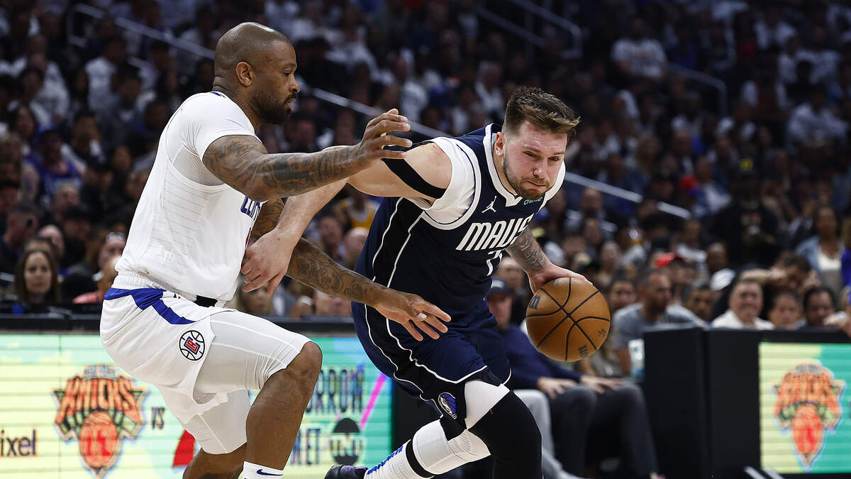 Luka Doncic #77 of the Dallas Mavericks controls the ball against P.J. Tucker #17 of the LA Clippers in the second half during game five of the Western Conference First Round Playoffs at Crypto.com Arena on May 01, 2024 in Los Angeles, California. Photo: Ronald Martinez / Getty Images Sport / Getty Images