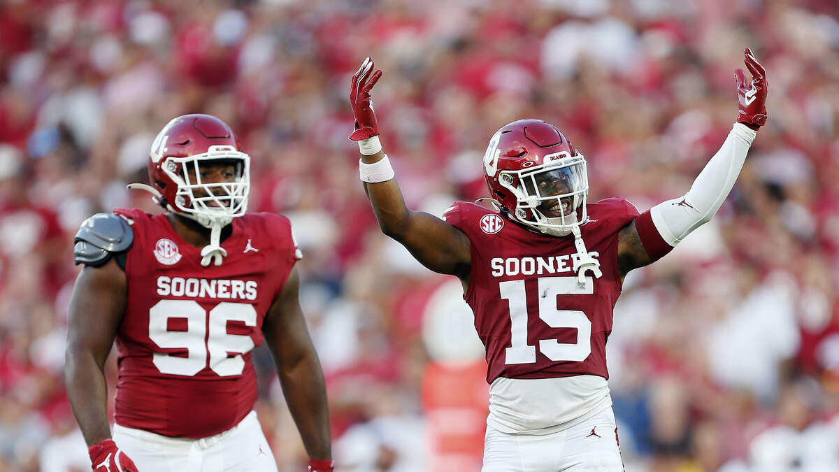 Defensive back Kendel Dolby #15 of the Oklahoma Sooners celebrates after sacking quarterback Forrest Brock #11 of the Temple Owls in the second quarter at Gaylord Family Oklahoma Memorial Stadium on August 30, 2024 in Norman, Oklahoma. Photo: Brian Bahr / Getty Images Sport / Getty Images