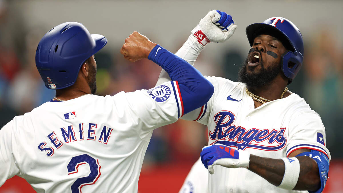 Adolis García #53 of the Texas Rangers celebrates his three-run home run with Marcus Semien #2 against the Los Angeles Angels in the first inning at Globe Life Field on September 5, 2024 in Arlington, Texas. Photo: Ron Jenkins / Getty Images Sport / Getty Images