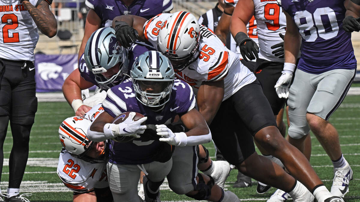 Defensive end Jaleel Johnson #95 and linebacker Jeff Roberson #22 of the Oklahoma State Cowboys tackle running back DJ Giddens #31 of the Kansas State Wildcats in the second half at Bill Snyder Family Football Stadium on September 28, 2024 in Manhattan, Kansas.Photo: Peter Aiken / Getty Images Sport / Getty Images